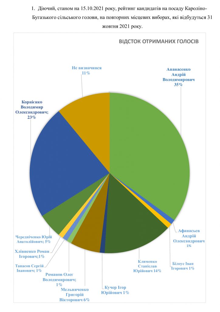 Аналізуючи результати опитування, можно зазначити, що основна боротьба за посаду голови Кароліно-Бугазької сільської ради відбувається між діючим сільським головою Апанасенко Андрієм Володимировичем та основним його опонентом Корнієнко Володимиром Олександровичем.