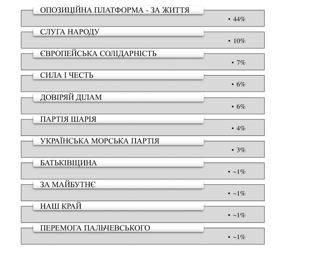 Партія, яка зайняла безсумнівне лідерство в зазначеній громаді: ОПОЗИЦІЙНА ПЛАТФОРМА — ЗА ЖИТТЯ, друге місце, з великим відставанням — СЛУГА НАРОДУ.
